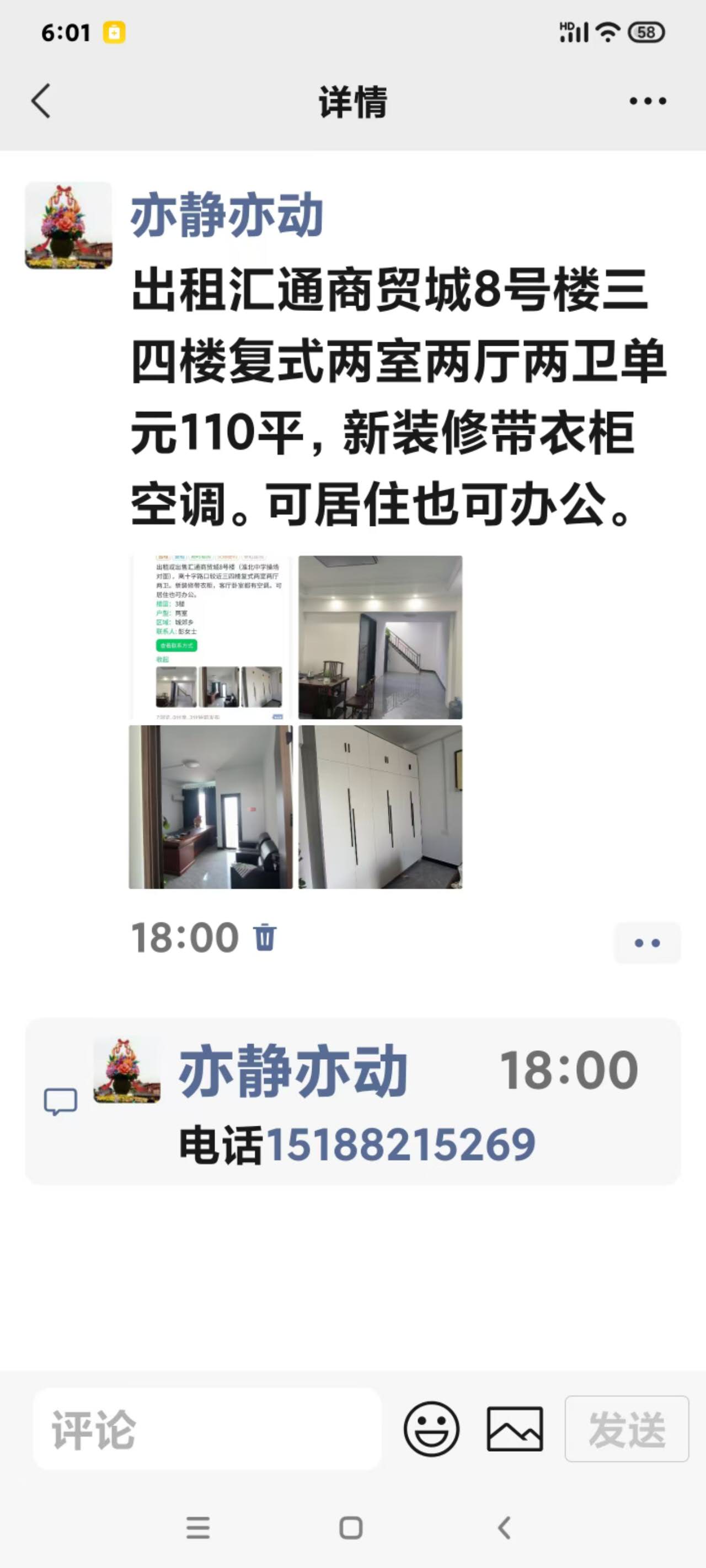 汇通商贸城8号楼(淮北中学操场对面),三四楼复式单元110平两室两厅两卫。新装修带空调衣柜,可居住可办公,如需要可配家俱床等。